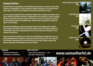 Es kann gut sein, dass Sie Samuel Harfst (sprich: wie „darfst“ mit „h“) schon einmal gehört haben. An die 500 mal spielte der 22-jährige Hesse schon solo und mit seiner Band auf deutschen, europäischen und australischen Straßen und Stränden. In den letzten 2 Jahren verkaufte er dabei über 20.000 CDs aus Eigenproduktion und erspielte sich so langsam aber sicher einen Geheimtippstatus in bundesdeutschen Singer Songwriter Kreisen.